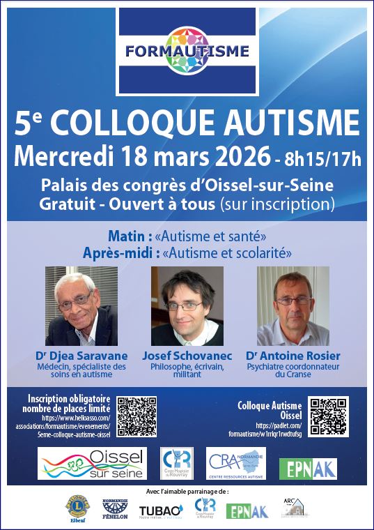 5ème Colloque Autisme le mercredi 18 mars 2026 de 8h15 à 17h au Palais des congrès d'Oissel-sur-Seine....