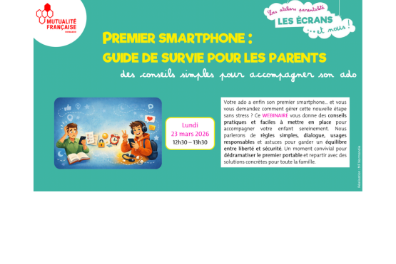 "Les écrans et nous - Premier Smartphone : guide de survie pour les parents", le lundi 23 mars de 12h30 à 13h30 en...